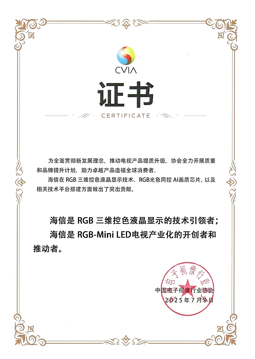 专家评审团一致认为,海信在 RGB-Mini LED 技术及高端显示芯片等领域的关键突破,标志着中国显示技术实现了从“追赶者”到“引领者”的历史性跨越,开启了全球电视产业新一轮显示技术革命。此次获得中国电子视像行业协会的技术认证,不仅是对海信在 RGB-Mini LED 领域持续创新与技术引领的高度认可,更是对其推动整个显示行业技术进步与产业升级的充分肯定。